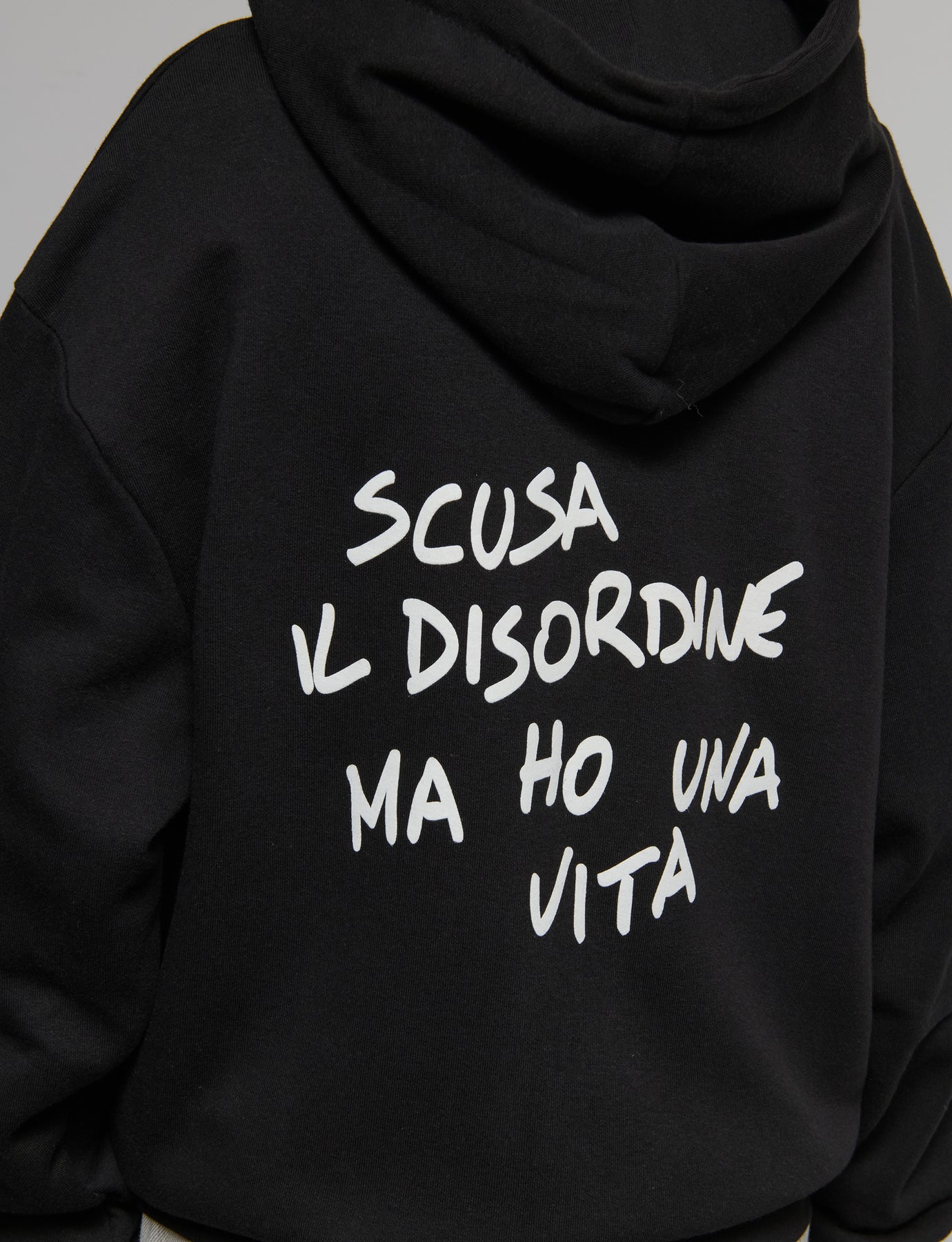 Felpa oversize con zip e scritta stampata sulla schiena. Composizione: 60% Cotone 40% Poliestere Colore: nero Ref: KITE-SCUSA
