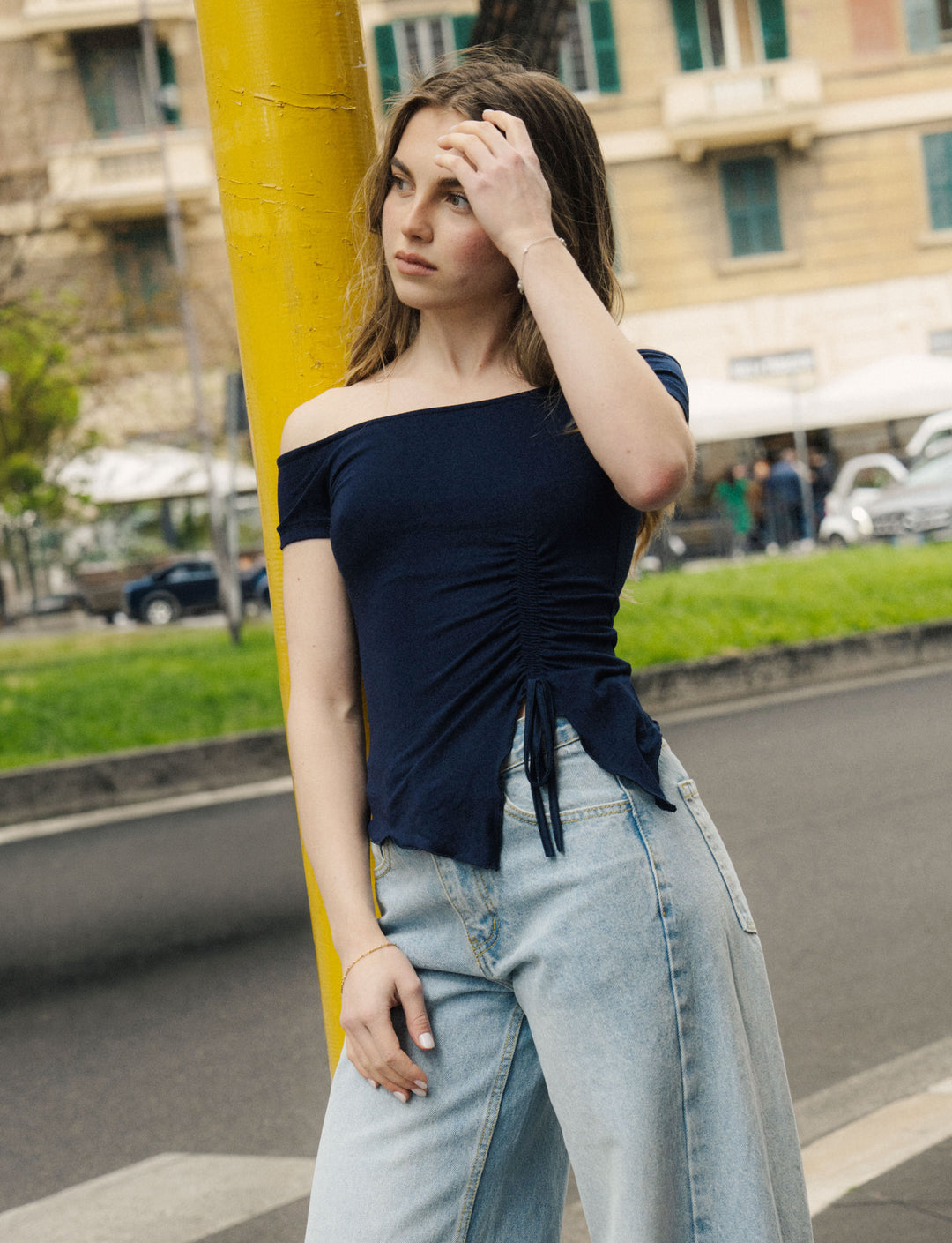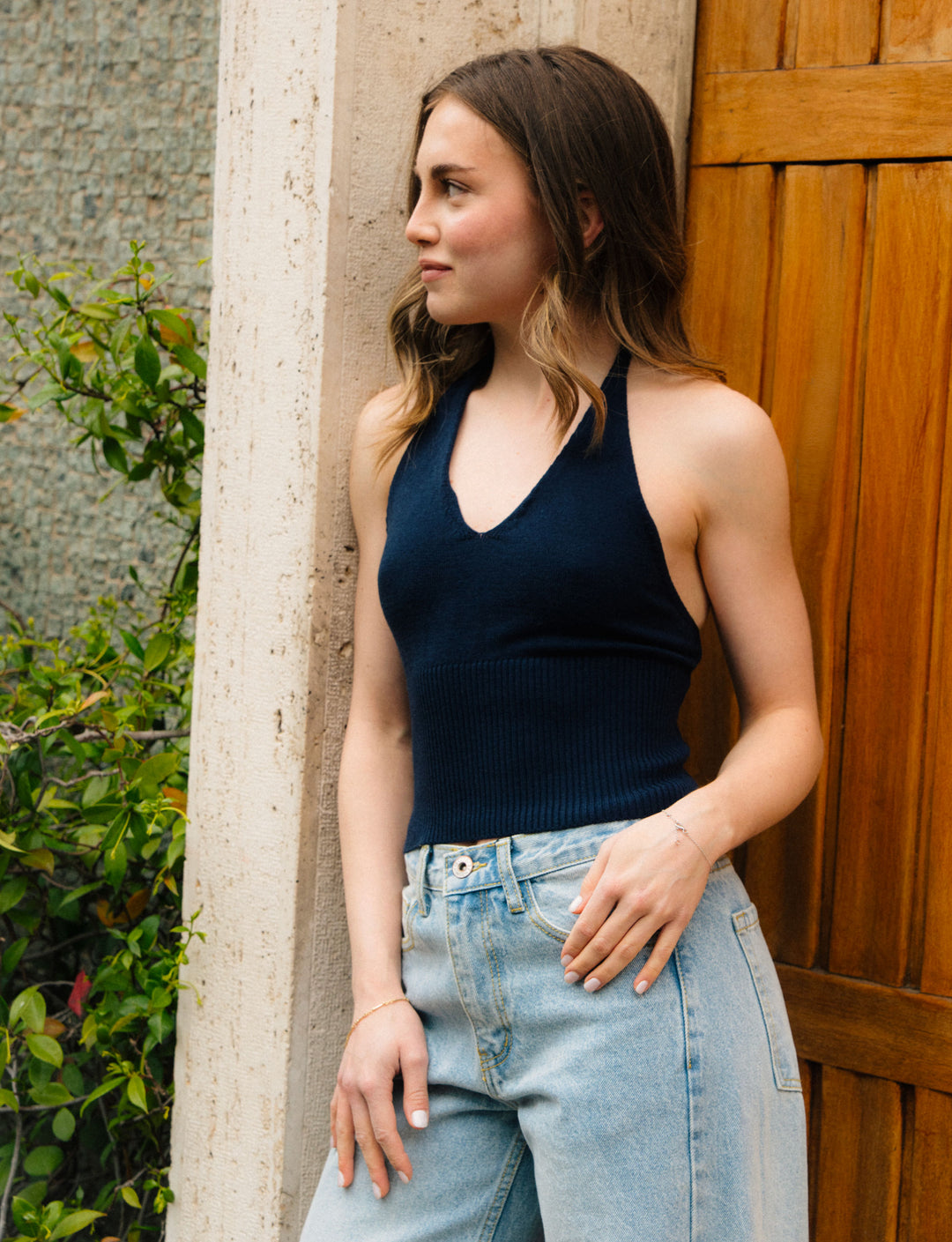 Top blu navy in lurex con scollo morbido e schiena scoperta