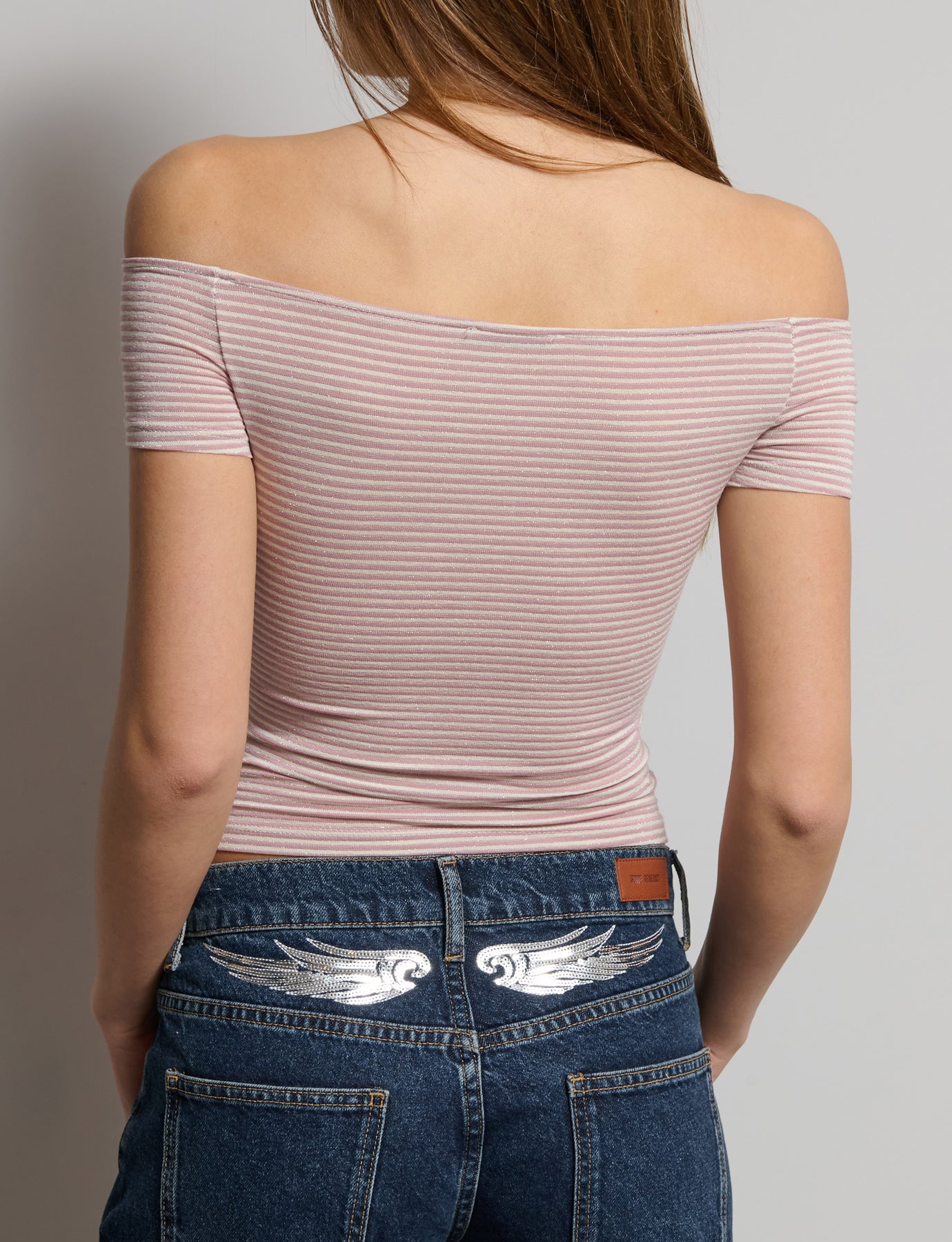 Top a righe con scollo dritto in tessuto glitter. Made in Italy. Composizione: 96% Viscosa 4% Elastane. La modella è alta 170cm e indossa una S. Colore: rosa REF: GLASCON-LX