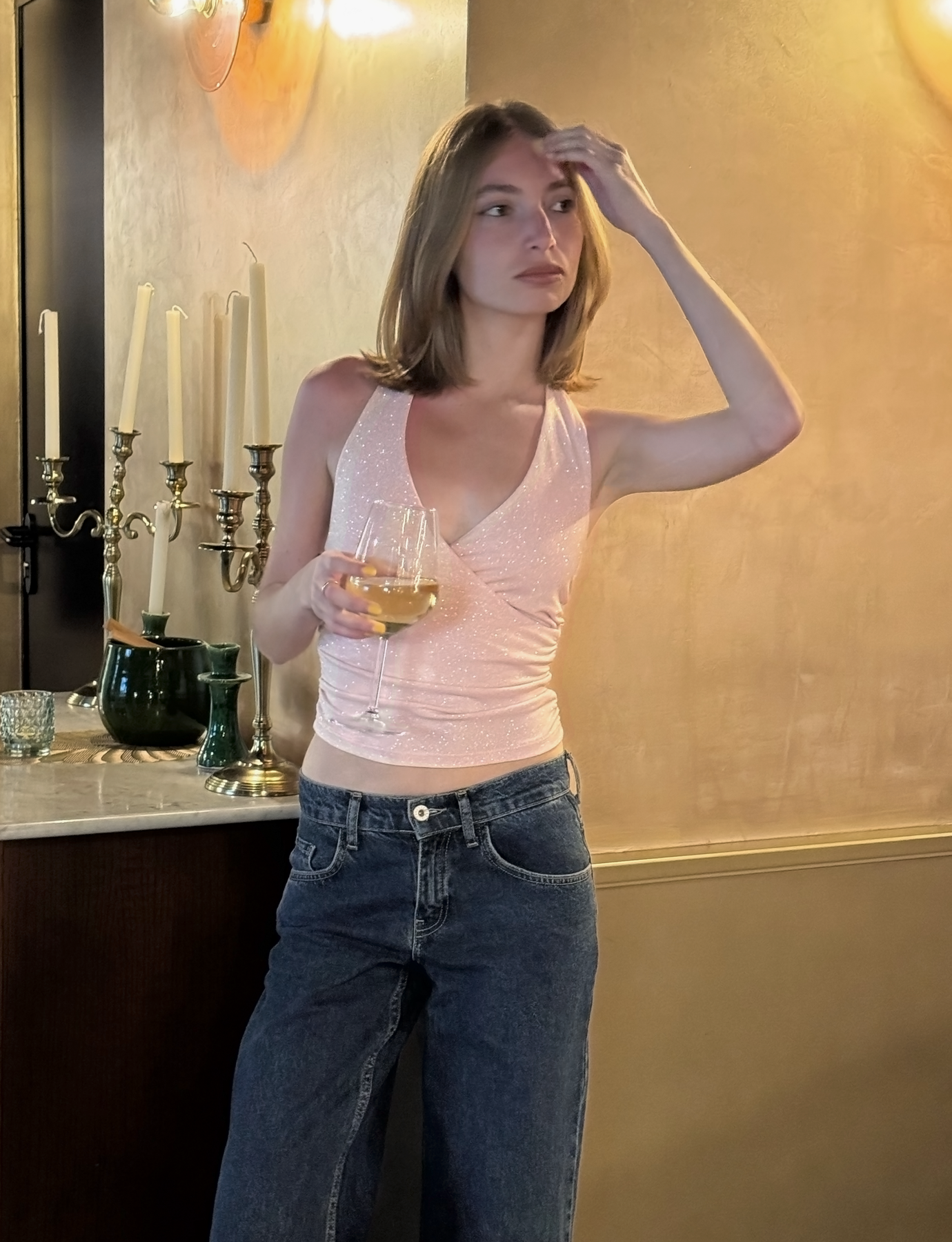 Top incrociato in tessuto glitter. Made in italy. Composizione: 96% Poliestere 4%Spandex. La modella è alta 170cm e indossa una S. Colore: rosa REF: ACTION-LX
