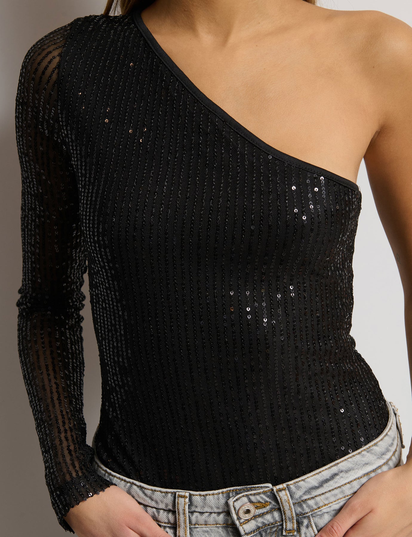 One-shoulder sequin bodysuit. Composition: 95% Polyester, 5% Elastane. The model is 170 cm tall and wears a size S. Color: Black Ref: BRILLIS