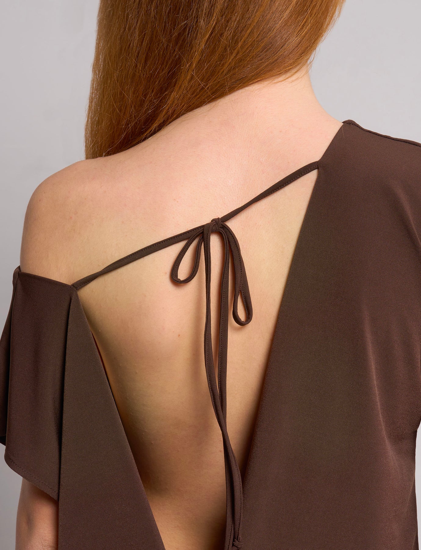 Soft brown mini dress with fitted skirt and open back.