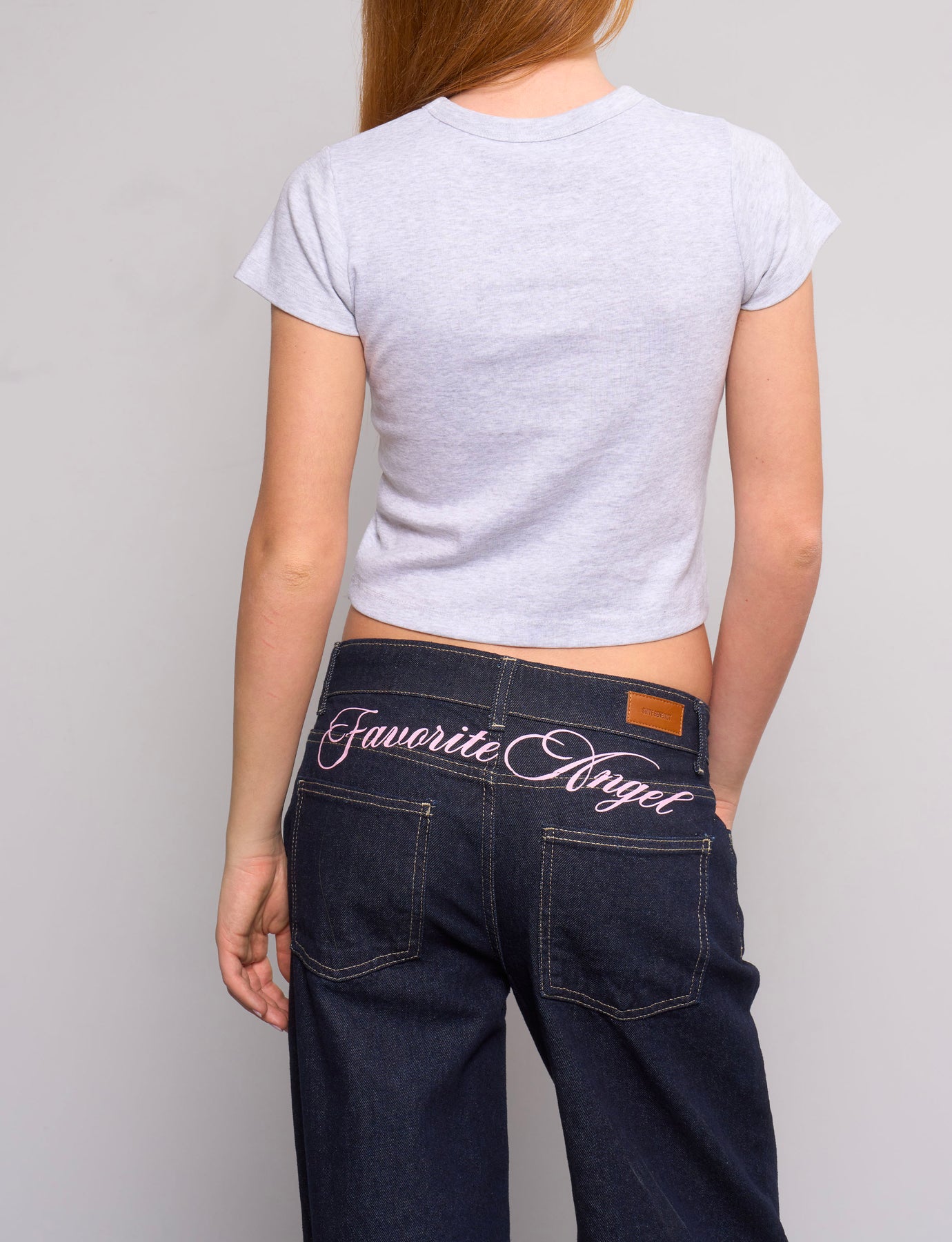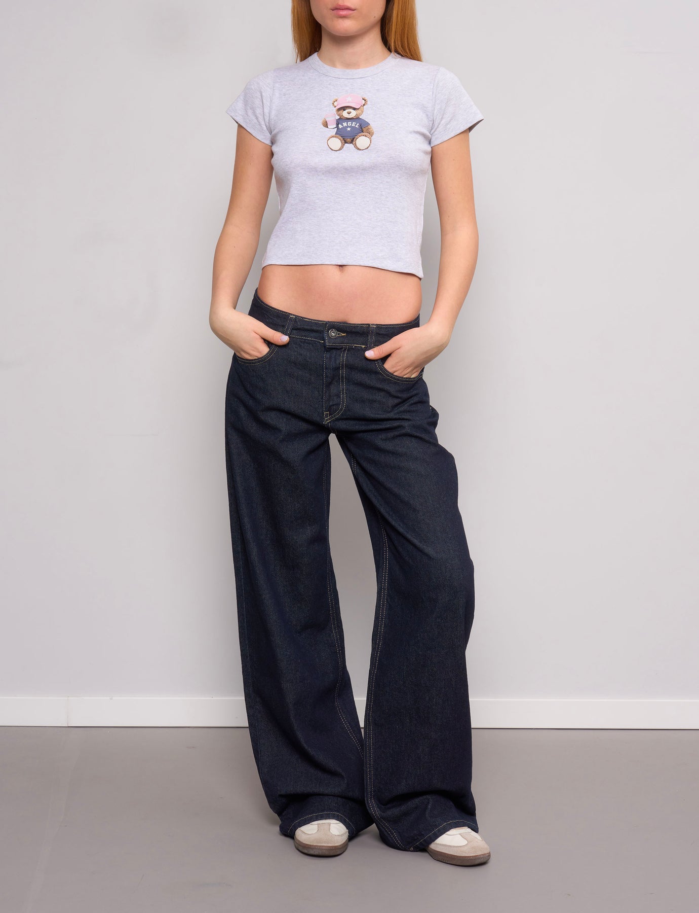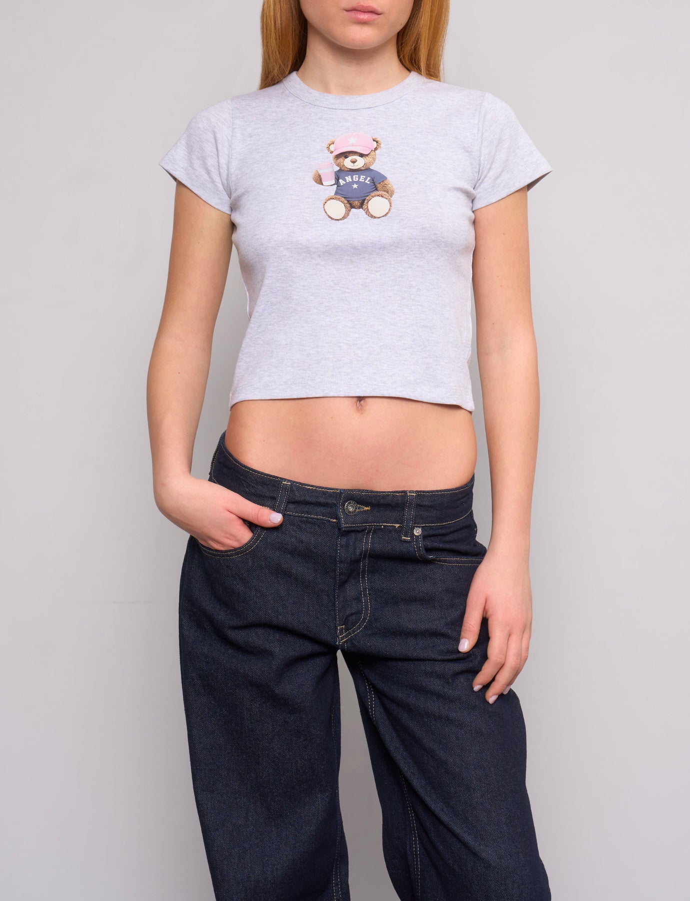 Light gray melange short-sleeved T-shirt with a round neck and a graphic teddy bear print on the front.