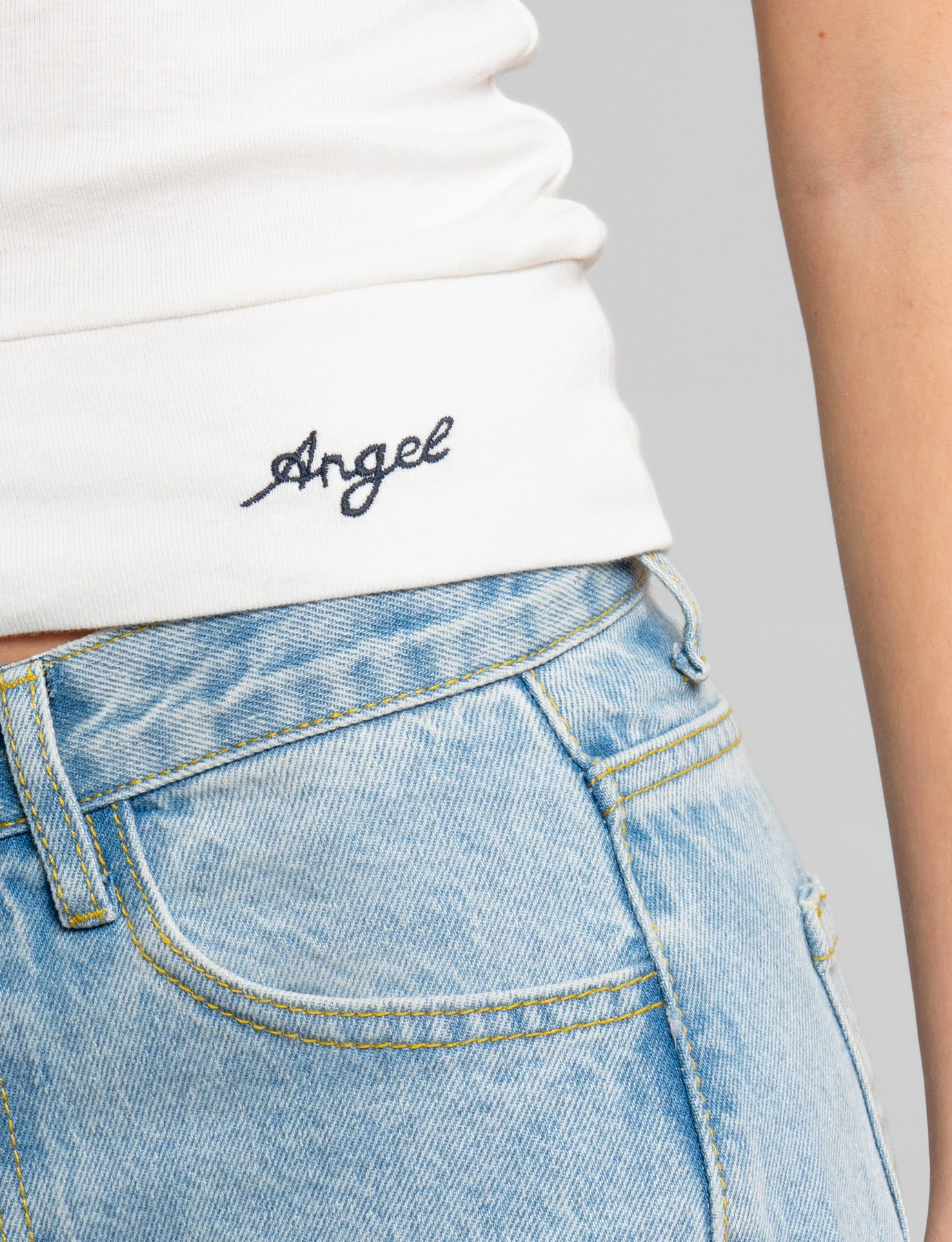 Cream short-sleeved T-shirt with a boat neck (off-the-shoulder) and embroidered "Angel" lettering