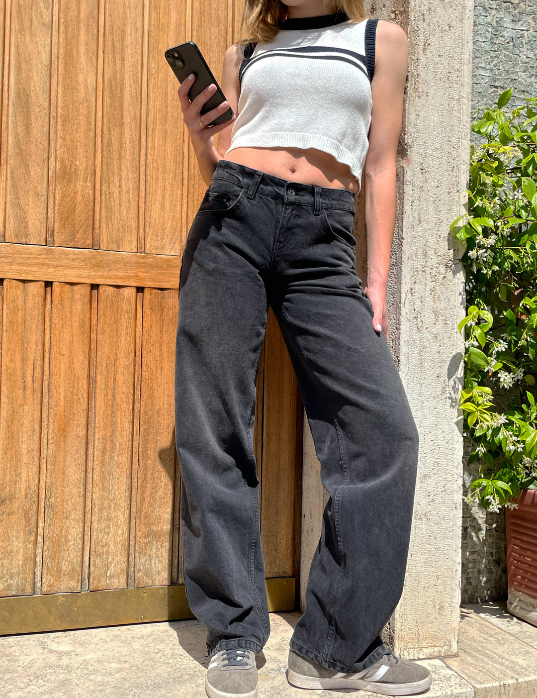 Straight jeans with rolled-up waist