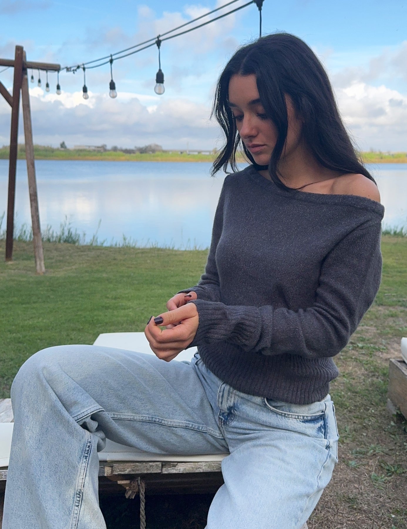 Off-the-shoulder sweater. Composition: 75% Acrylic, 22% Nylon, 3% Spandex.