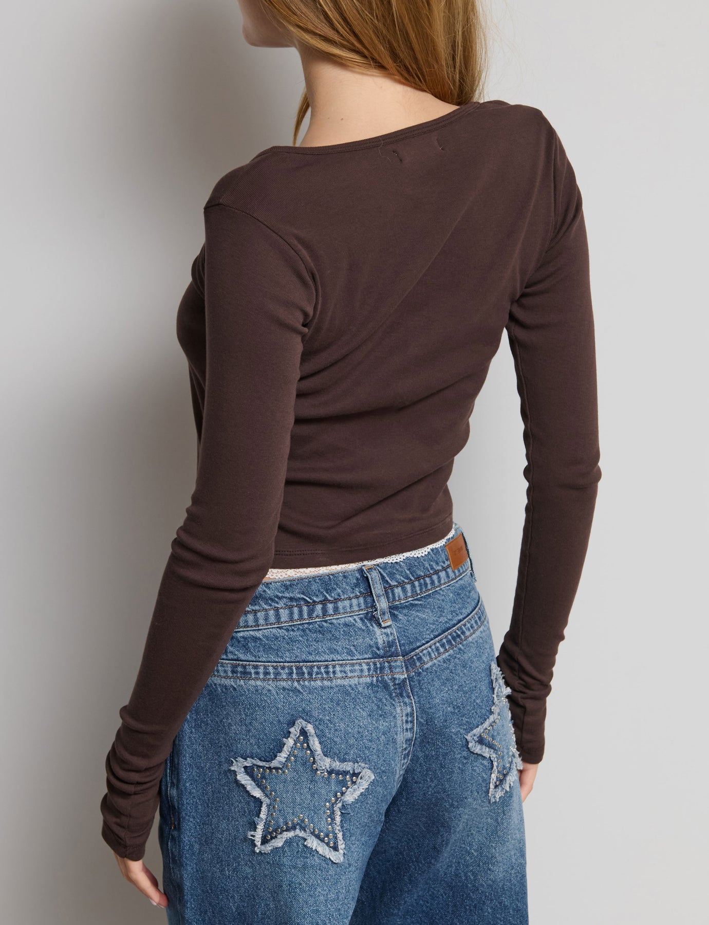 Long-sleeved top with buttons and lace and a double-effect. Composition: 100% Cotton. The model is 170 cm tall and is wearing a size S. Color: Brown Ref: GENEVE-Y