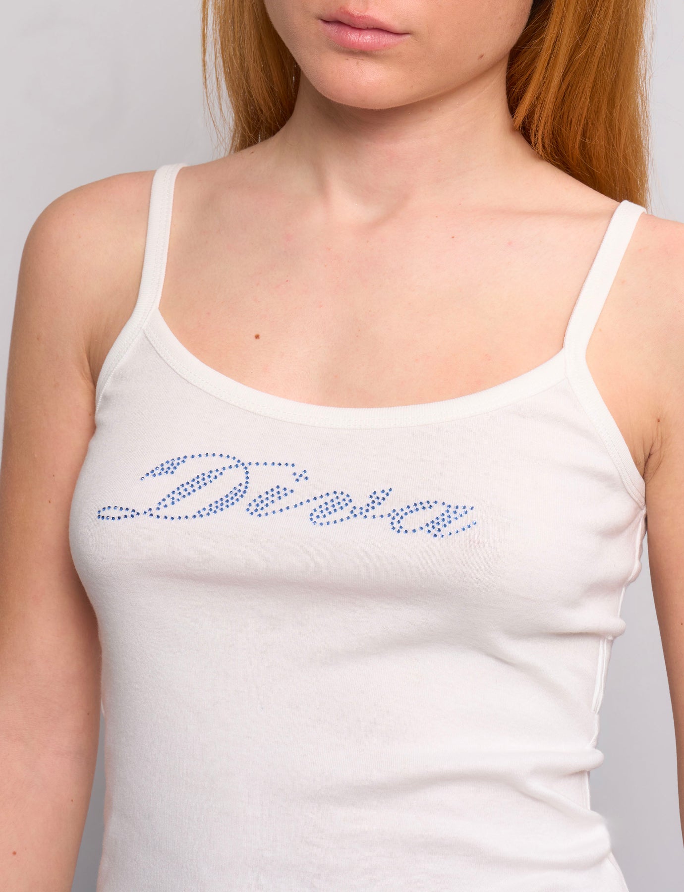 Cream tank top with spaghetti straps and "Diva" lettering in cursive with blue rhinestones