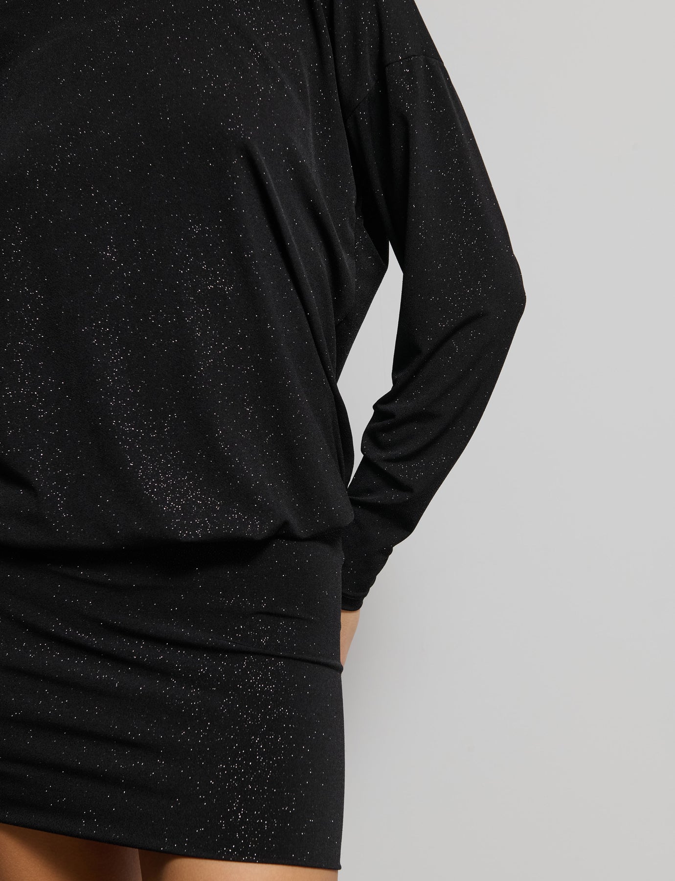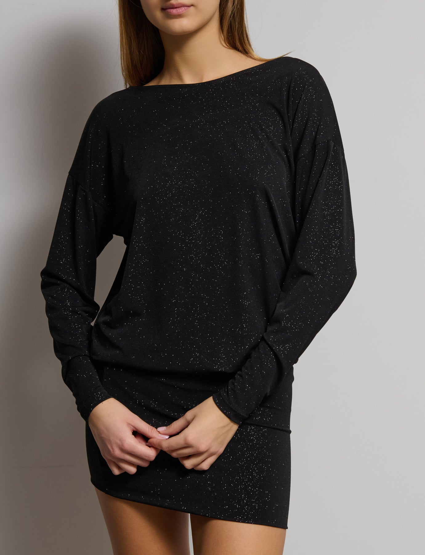 Loose-fitting dress with open back in glitter fabric. Made in Italy. Composition: 96% Polyester, 4% Spandex.