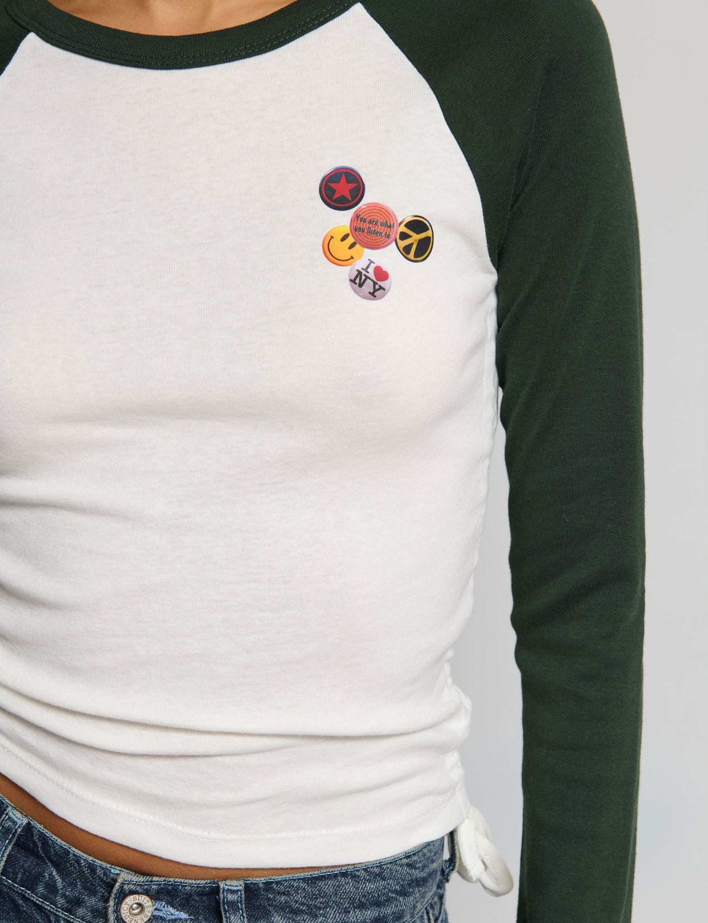 Two-tone raglan long-sleeve printed T-shirt with drawstring sides and pin print. Composition: 100% Cotton.