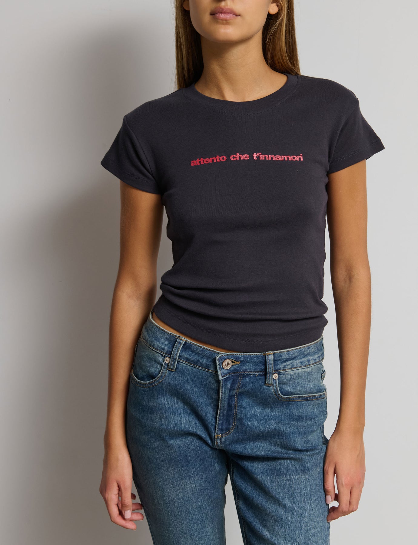 T-shirt manica corta con scritta stampata Composizione: 100% Cotone La modella è alta 170cm e indossa una S. Colore: blu Ref. TIROLO-ATTENTO