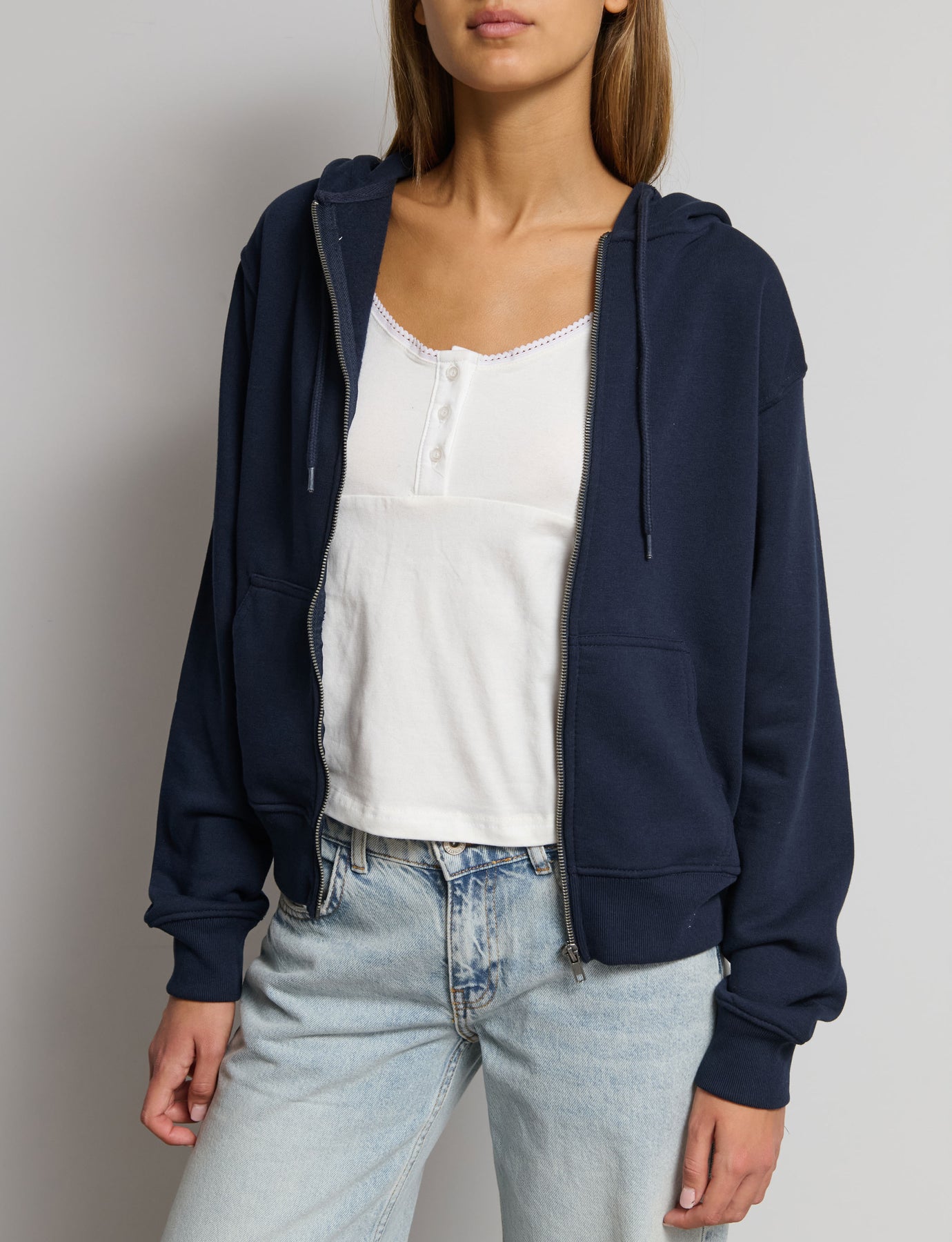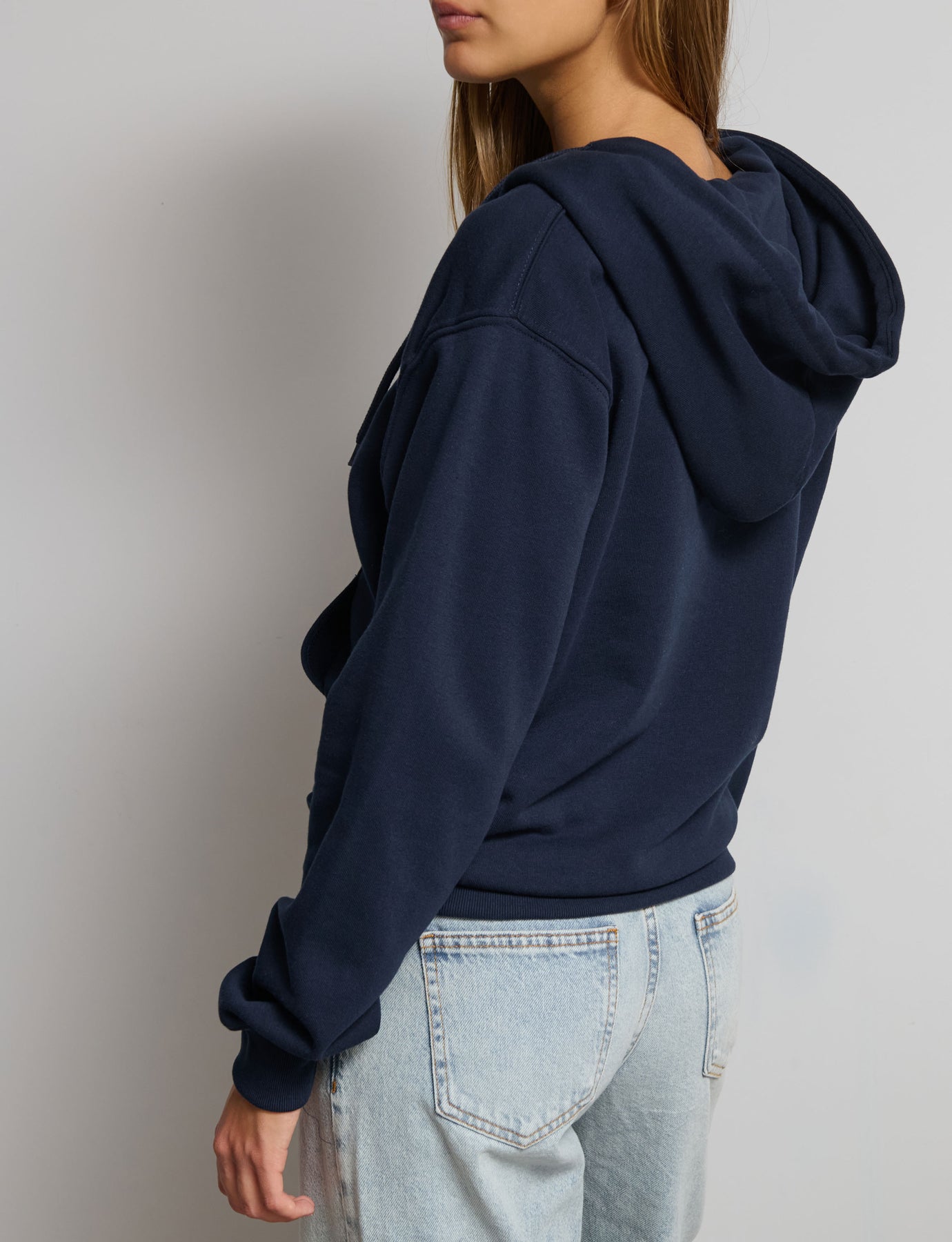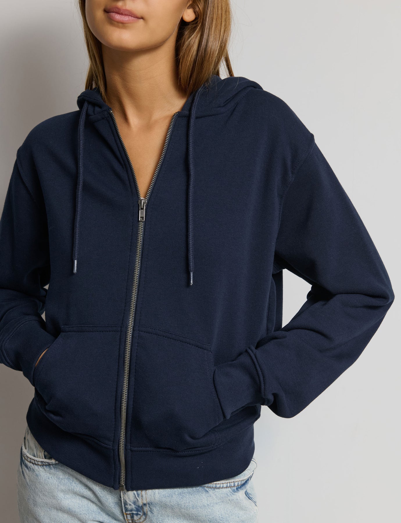 Felpa regular con cappuccio e chiusura con zip Composizione: 60% Cotone 40% Poliestere La modella è alta 170cm e indossa una S. Colore: blu Ref: KHLOE
