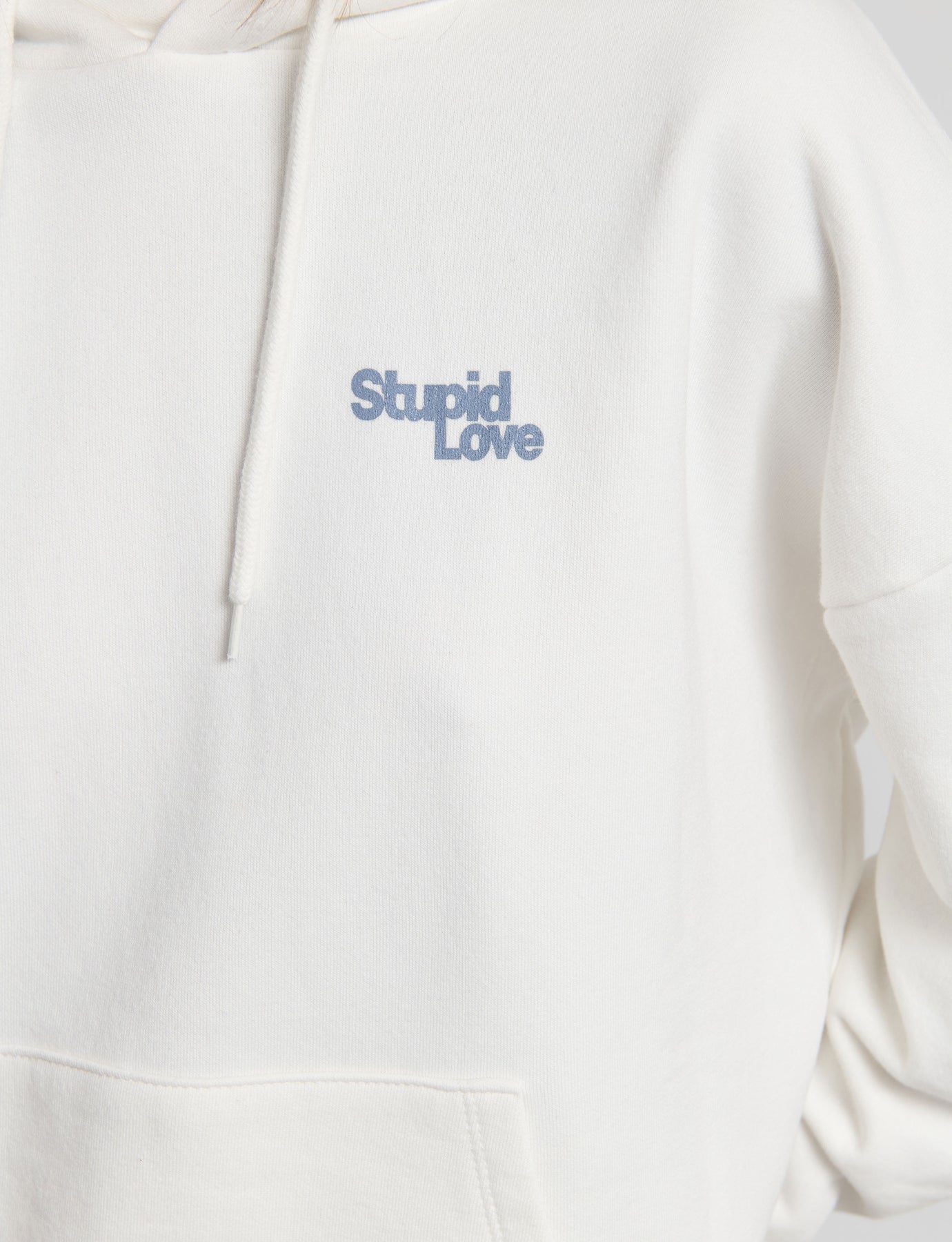 Felpa oversize cappuccio con laccetti e stampa davanti e dietro. Composizione: 60% Cotone 40% Poliestere Colore: bianco Ref: KEIRA-STUPID