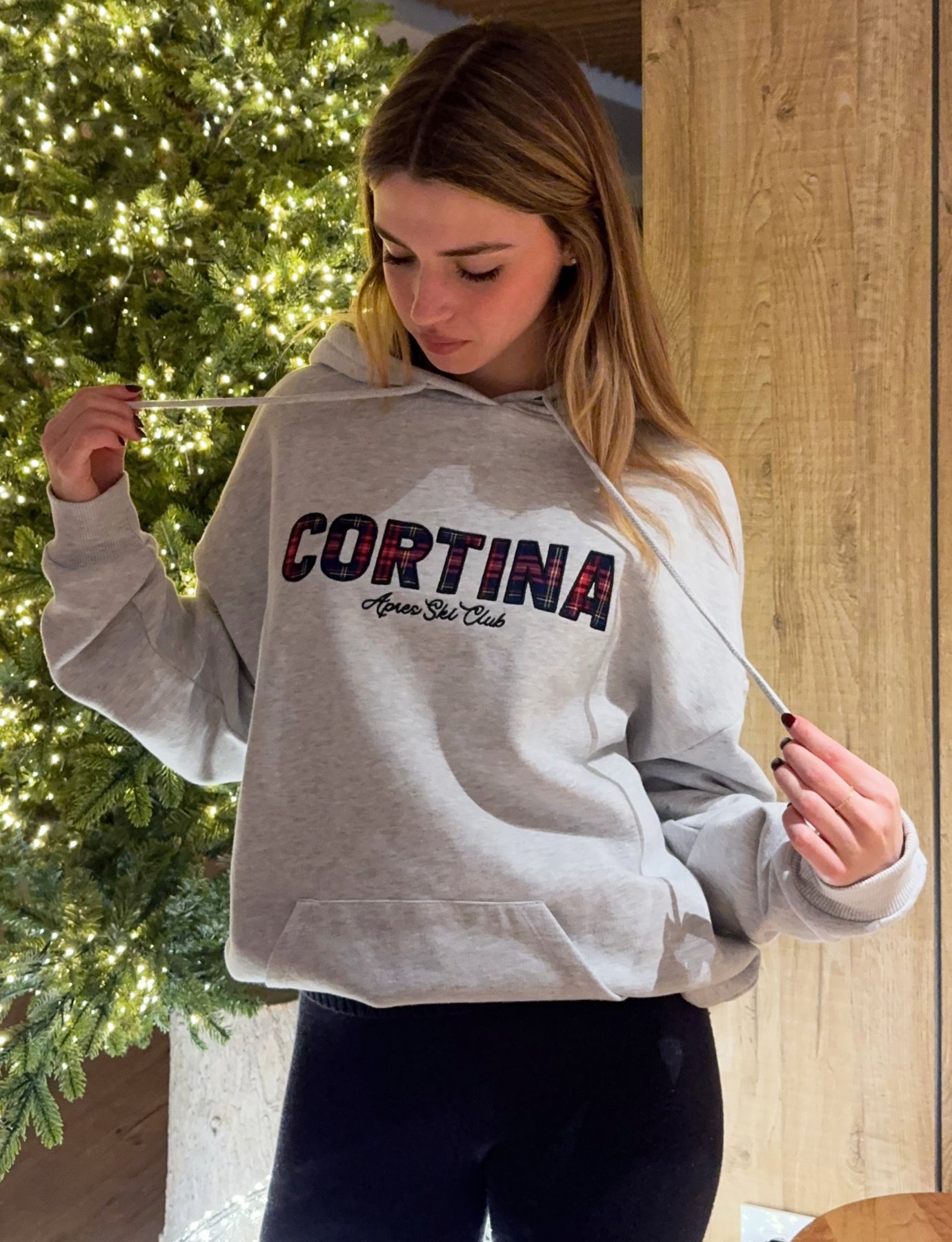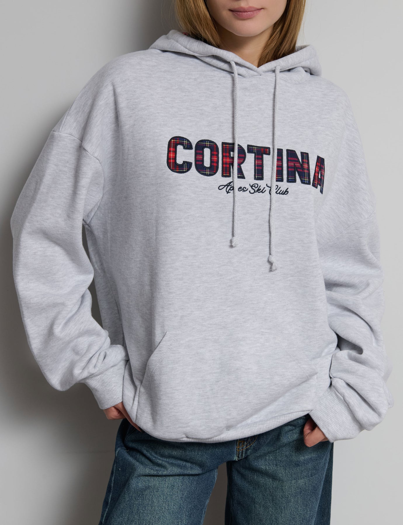 Felpa oversize cappuccio con laccetti e applicazione in tessuto tartan sul davanti. Composizione: 60% Cotone 40% Poliestere