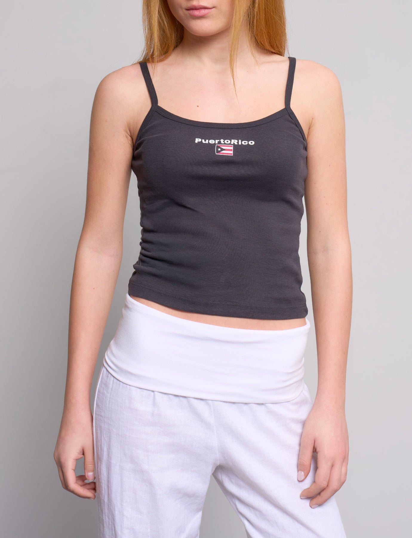 Top canotta blu notte con spalline sottili, con scritta "Puerto Rico" stampata frontalmente e grafica della bandiera.