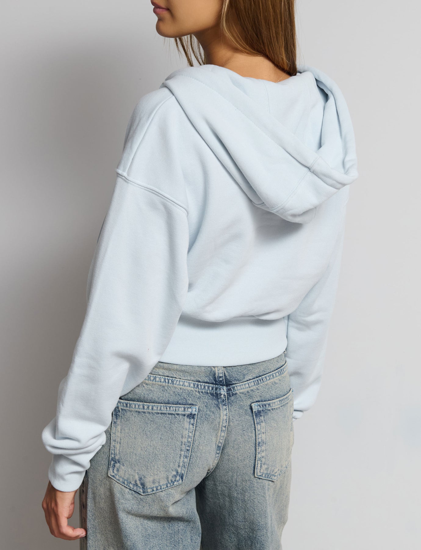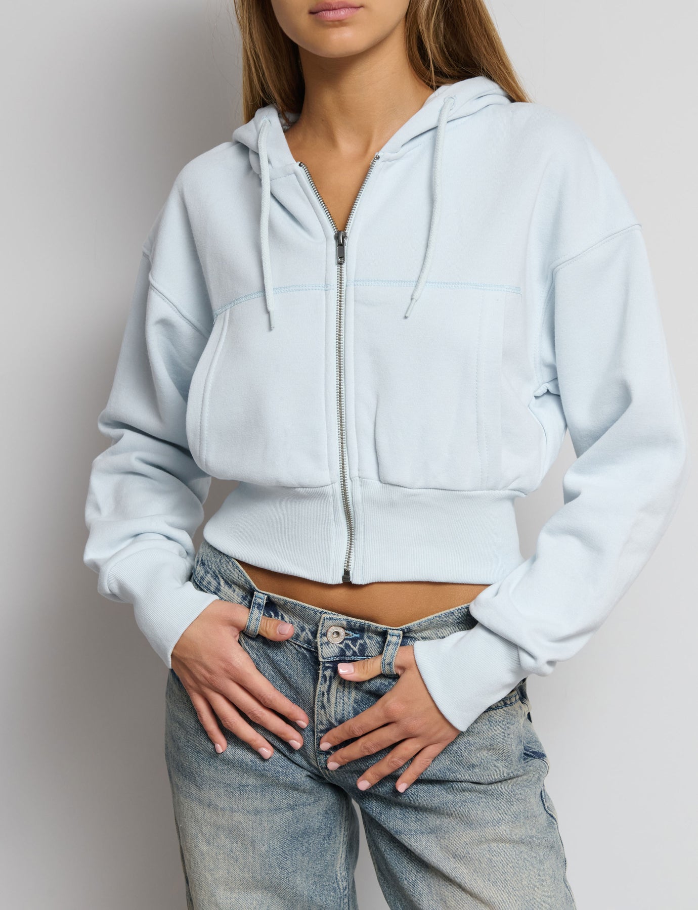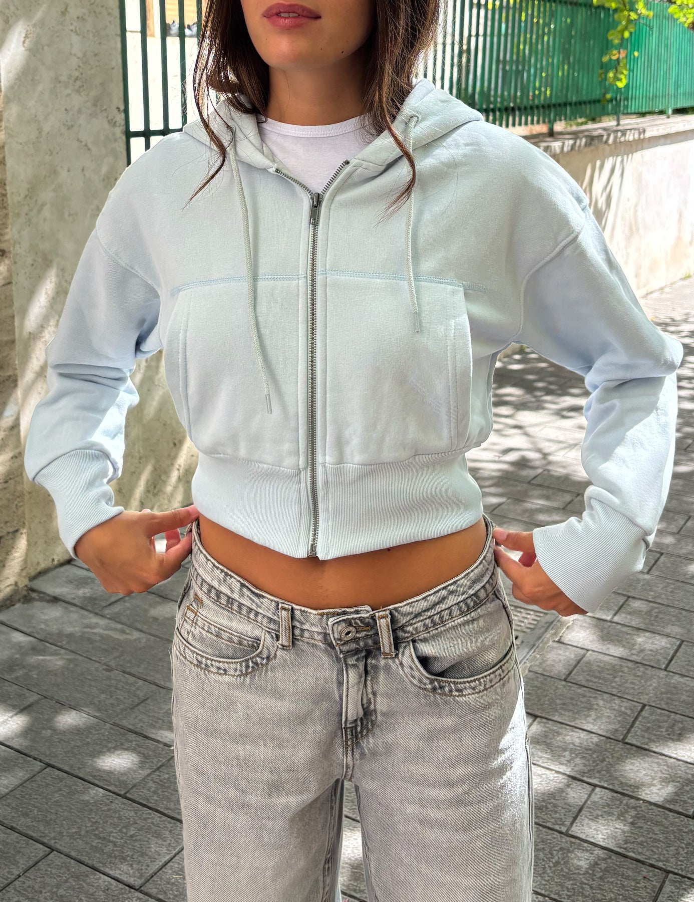 Felpa con cappuccio crop e chiusura con zip con tasca davanti Composizione: 60%Cotone 40%Poliestere La modella è alta 170cm e indossa una S. Colore: azzurro Ref: KOREA251
