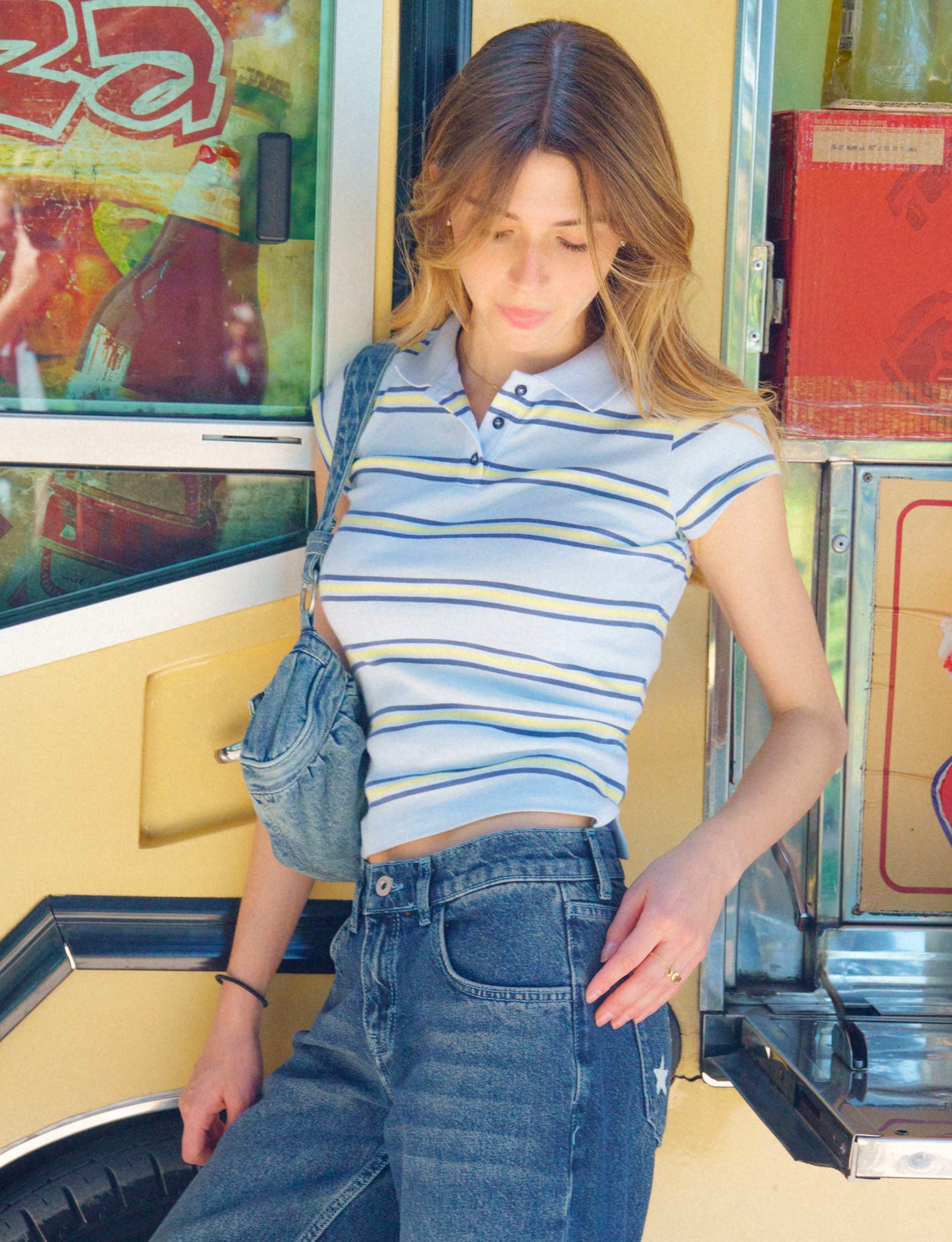 Polo a maniche corte a righe azzurre e gialle, con colletto classico e chiusura a bottoni