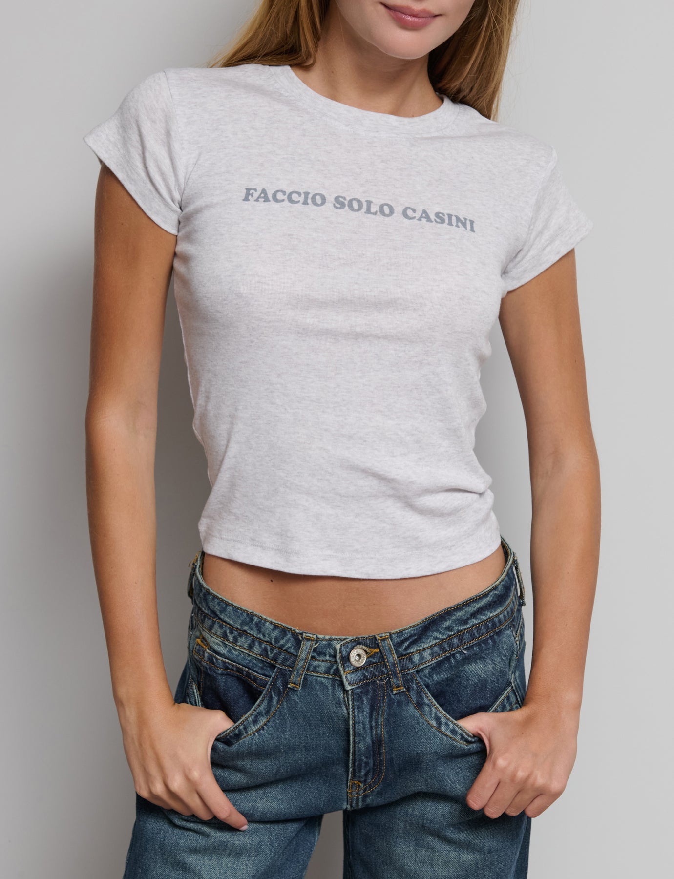 T-shirt manica corta con scritta stampata Composizione: 100% Cotone La modella è alta 170cm e indossa una S. Colore: grigio Ref. TIROLO-CASINI