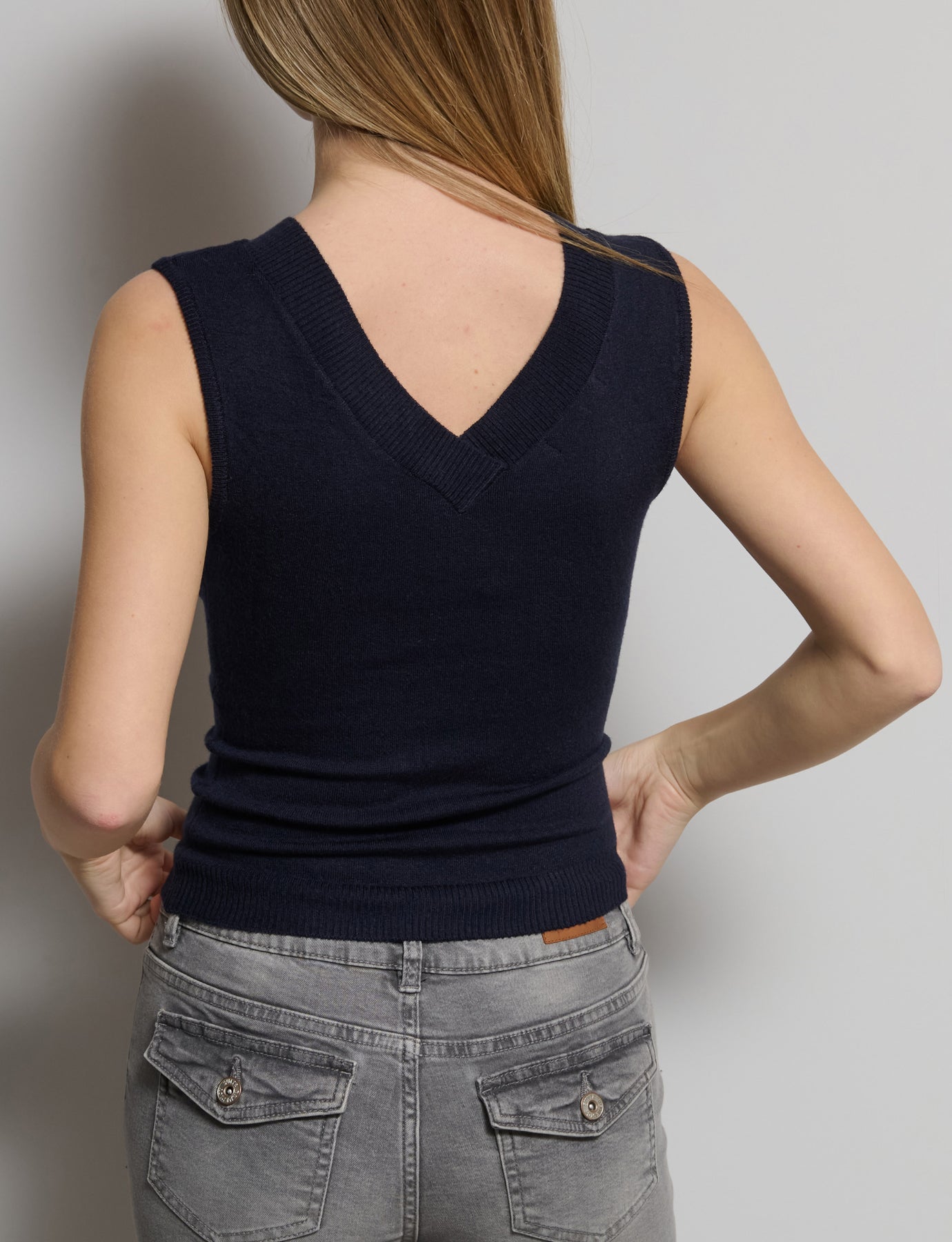Top in maglia giro manica con scollo a V. Composizione: 88% Acrilico 11% Nylon 1% Elastane.