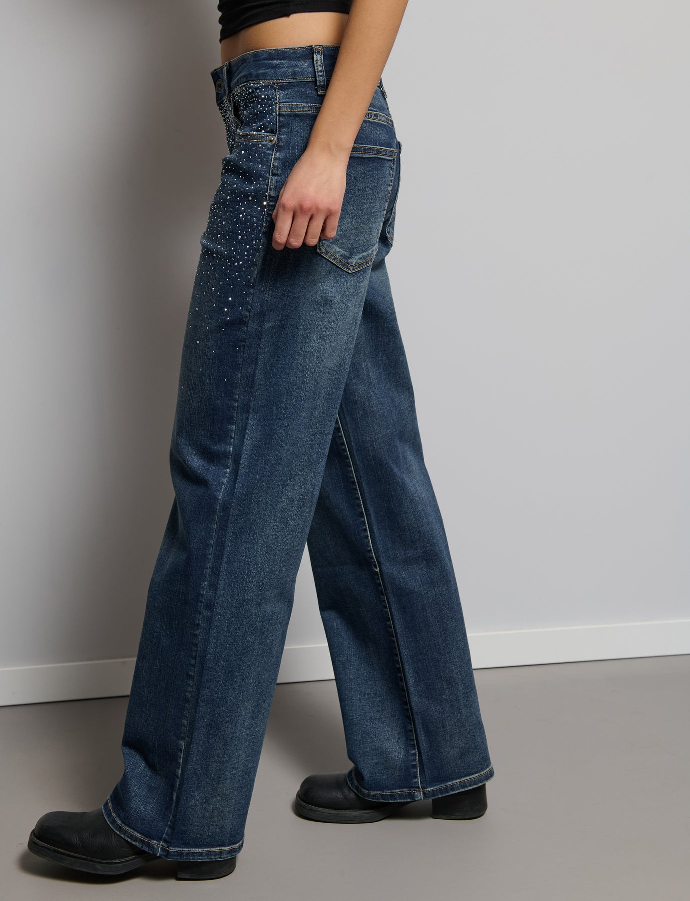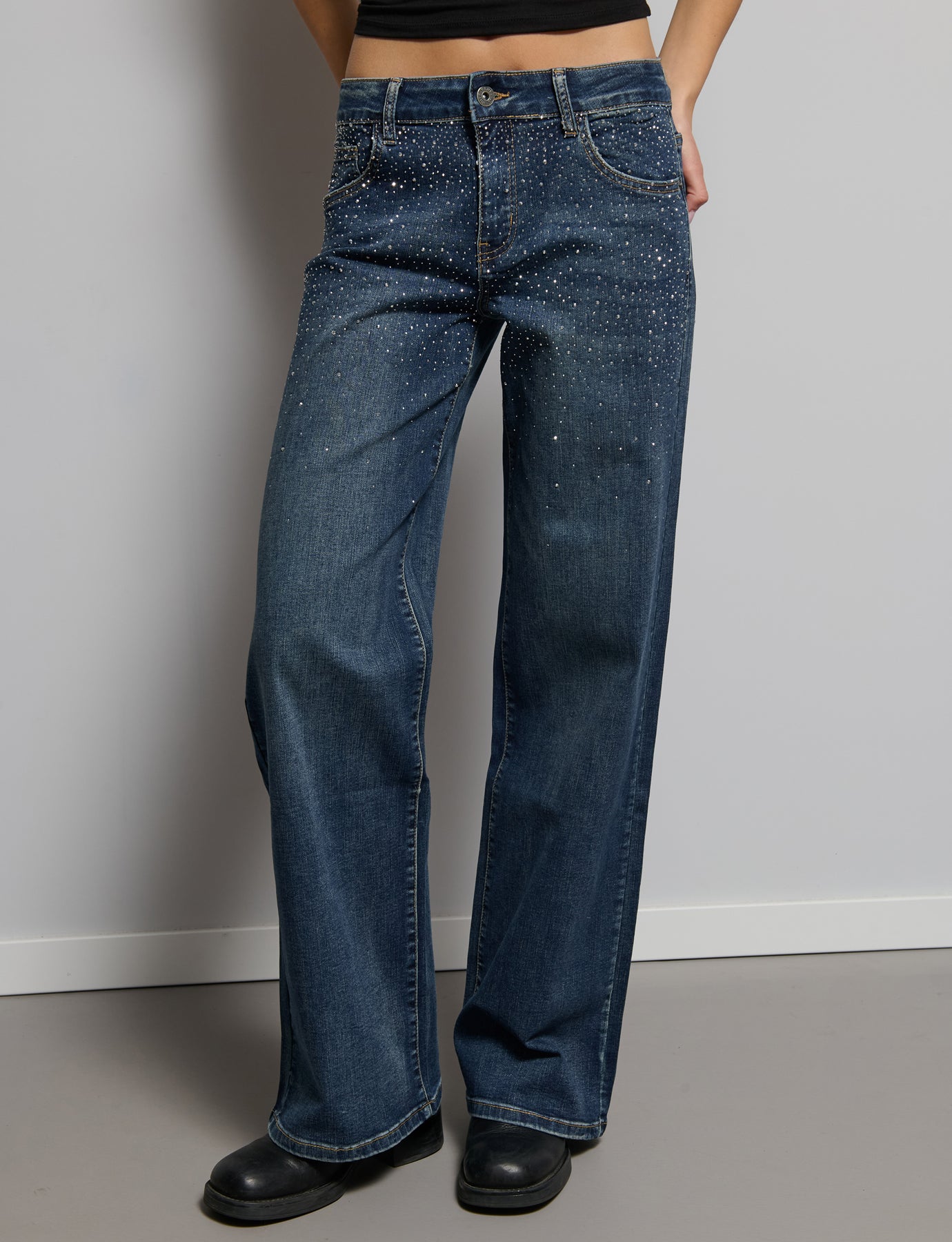 Jeans dritto con strass applicati a pioggia Composizione: 98% Cotone 2% Elastane La modella è alta 170cm e indossa una 28. Ref: JENNER